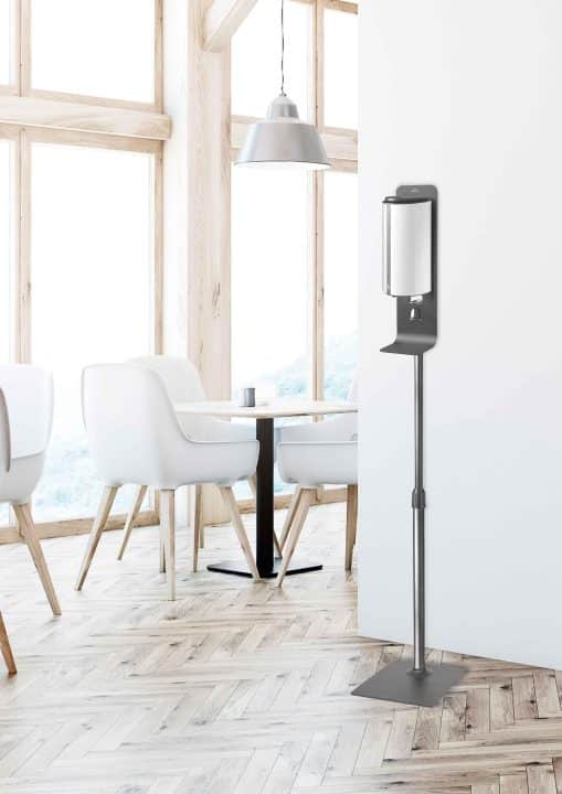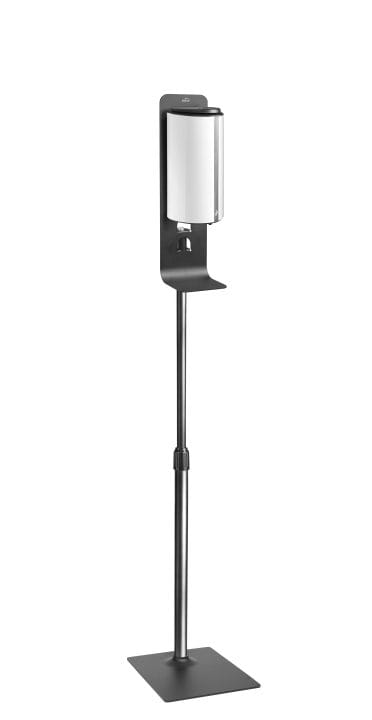 Suporte de pé metálico preto de 160 cm de largura com distribuidor automático de gel hidroalcohólico em ABS cor branco, com depósito de 850 ml de capacidade.