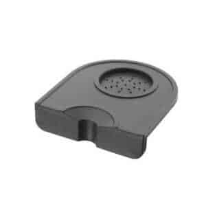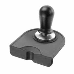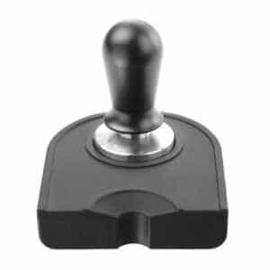 Em silicone, com encaixe para colocar um porta-filtros para calcar o café.
