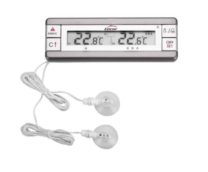 Termômetro com base magnética, dupla sonda, ecrã duplo e alarme para medir a temperatura no interior da geladeira e o freezer.