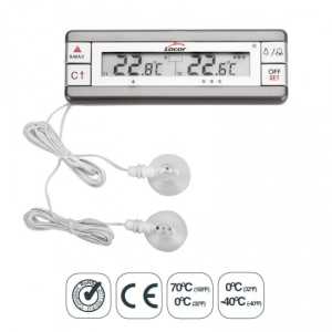 Termômetro com base magnética, dupla sonda, ecrã duplo e alarme para medir a temperatura no interior da geladeira e o freezer.