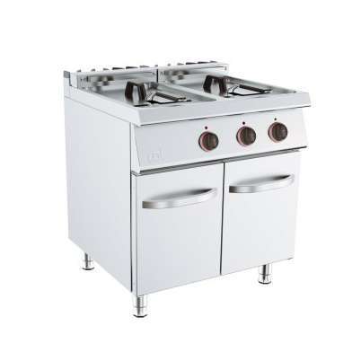 Cuba dupla Chaminé de ferro fundido esmaltado resistente a riscos Armário com portas Queimador com ignição piezoelétrica Controle de temperatura termostático Cestos de aço inoxidável Temperatura de aquecimento ajustável Luzes indicadoras de acionamento Resistência tubular de aço inoxidável