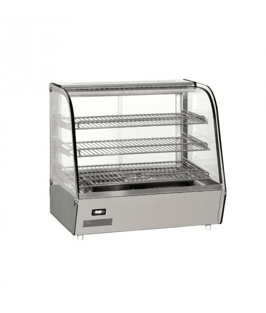 Vitrine quente expositora de bancada com máxima exposição em espaços reduzidos, estrutura em aço inoxidável, vidro curvo, temperatura regulável +30ºC a +90ºC, 3 prateleiras, volume útil de 120lts e depósito para recolha de condensados.