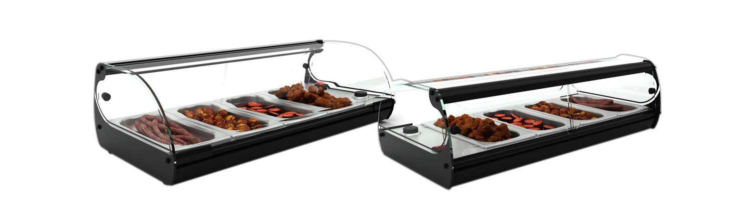 Vitrine expositora aquecida com containers incluidos Com vidro curvo e temperado Interior em aço inox AISI304 Desmontavel de facil limpeza sem LED