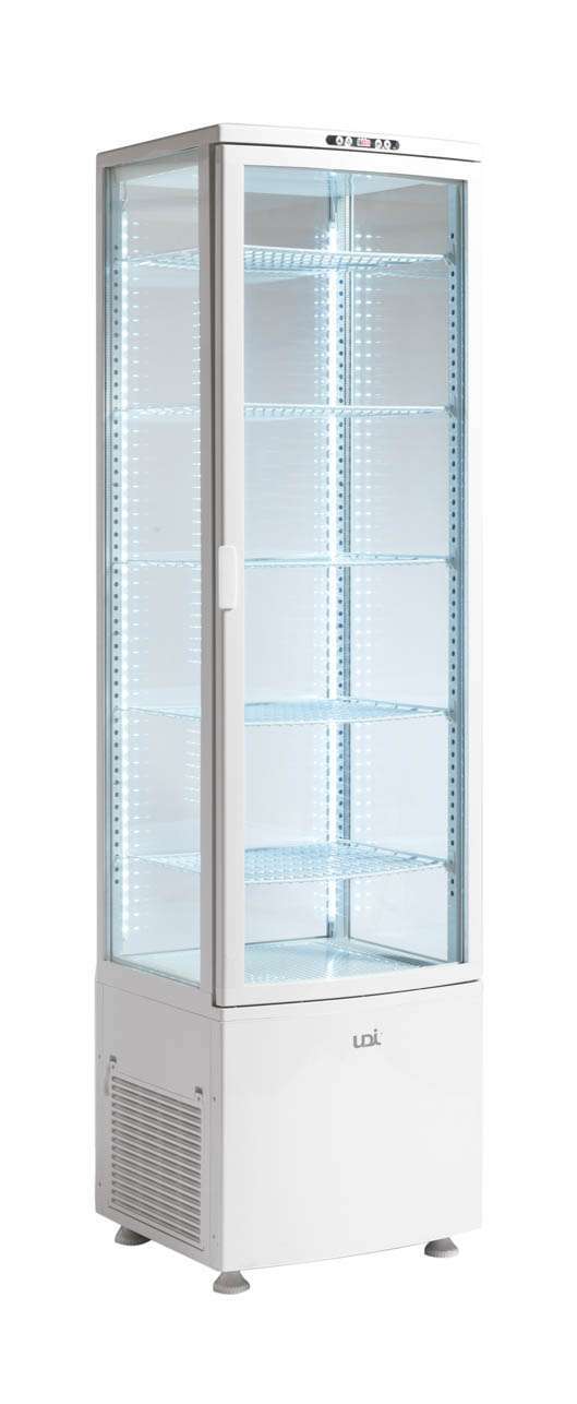 Vitrine expositora com grelhas ajustáveis. Com luz interna LED. Com painel frontal electronico. Cor branca.