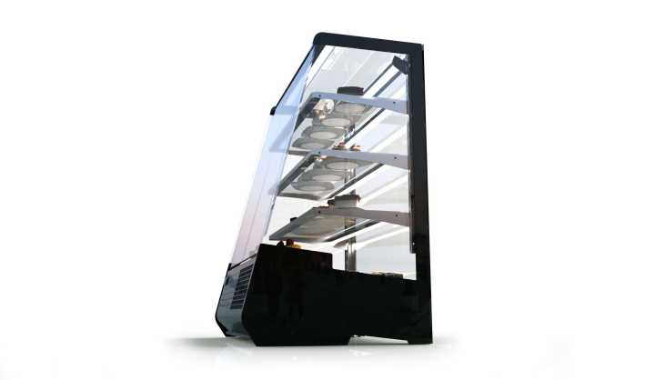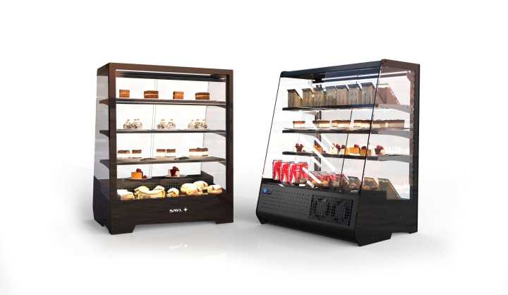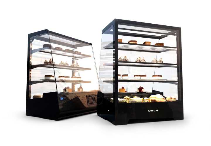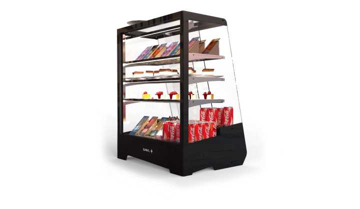 Expositor de linhas retas de grande capacidade, ideal para estar embutido ou sobre o balcão.